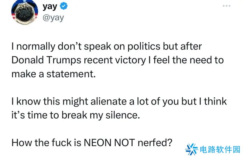 yay发文花式整活,原文大意如下:我通常不会谈论**,但唐纳德·特朗普最近的胜利让我觉得有必要发表声明。我知道这可能会疏远你们很多人,但我认为是时候打破沉默了,为什么TMD霓虹还没有被削弱?
