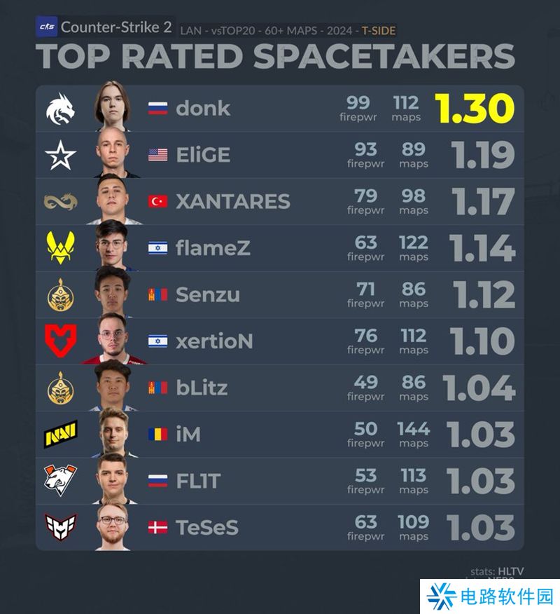 从数据看,donk最能为队伍争夺地图控制权,他在112张地图上凭借99的火力值拿到了1.30的rating;第二名是EliGE,89张地图93的火力值,1.19 rating;第三名是XANTARES,98张地图79的火力值,1.17 rating。