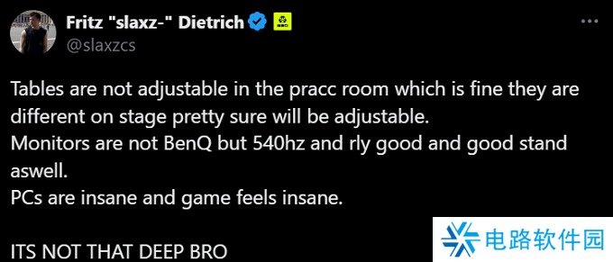 在其他职业选手在抱怨主办方提供的桌子和显示器的动态下,他回复了一段话:“训练室的桌子不能调节,这没问题,我确定之后舞台上的桌子会是可调节的。显示器虽然不是BenQ(明基),但它有540Hz,用起来真的很棒,就连电脑支架也很好。电脑不仅性能超强,游戏里也感觉非常丝滑。”他强调:“这事没那么复杂,兄弟。”