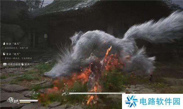 6.“且住,休得往前”遇到两只小怪,直接打,走过朱桥这里就是苍狼林,长按右键可以蓄力重击。干掉这个妖怪正好升级获得技能点,可以提升属性或者棍法,选择解锁移花棍步,伤害不高,但是可以阻挡飞行道具,游戏中没有地图,只有自己摸索。