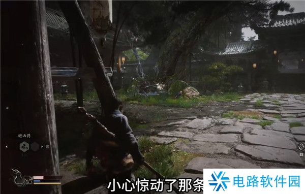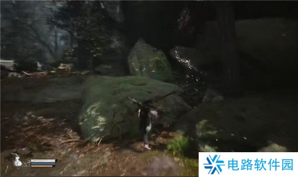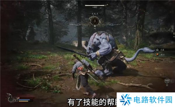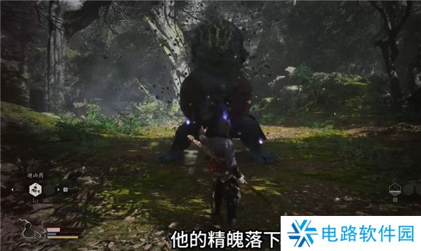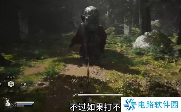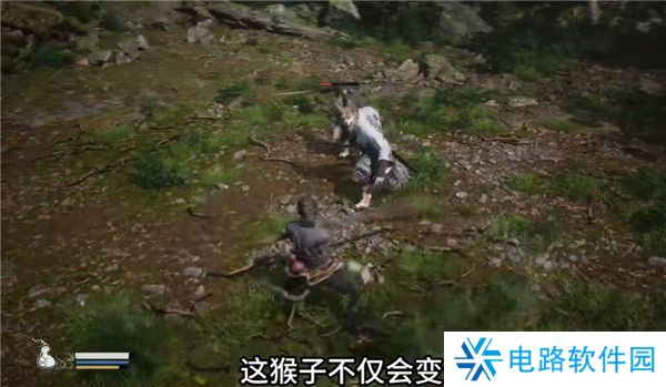 8.再往前走会遇到一个牯护院怪物,他的前摇很长,打不过土地公会释放定身术帮助猴子,即是花果山来的故人教你一招,手伸出来,这样子主角天命人学会了第一个技能定身法,将手一指,将对手定在原地不得动弹。