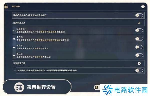 推荐的「通用锁定方案」和「套装锁定方案」均已按照常见用途设置好自动锁定的属性。并且随着游戏的更新,开发组还会对推荐套装方案进行调整,无需旅行者重复操作。如果想要方便省事,可以直接一键开启;如有更细致的个性化需求,可以给各套装或部件设置单独的方案。