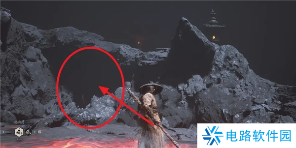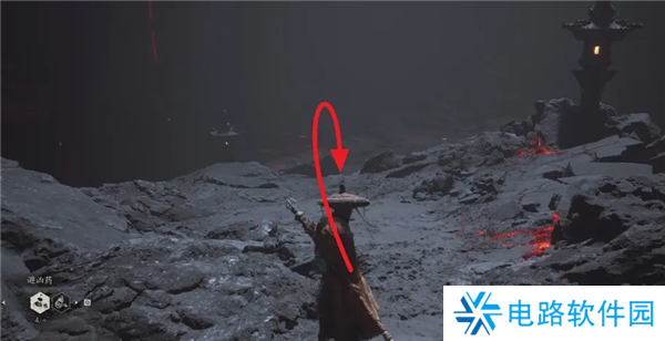 沿着山路一直往前走到斜坡快到底部的位置,可以看到前方两个是灯笼,从石灯笼处往下跳,可以看到岩壁上有个山洞。这里也可以直接走到底然后走进山洞,因为附近环境比较像,所以用石灯笼来做标志物方便大家区分。