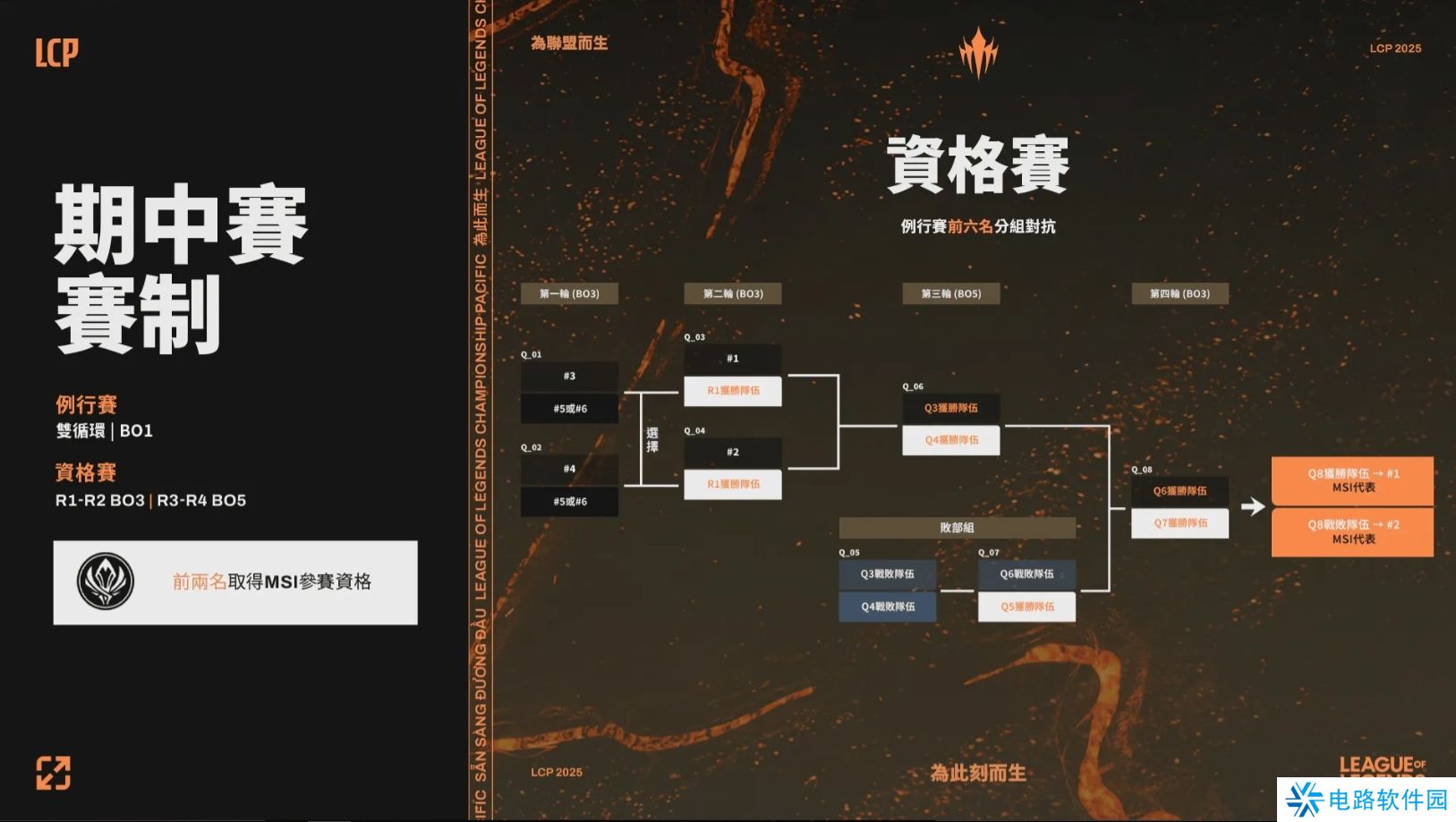 双循环BO1赛制,决出进入季后赛的前六只支队伍。这六支队伍将在第一轮和第二轮进行BO3较量,并在最后进行BO5,最终前两名获得参加MSI的资格。同时,季中赛的表现也将影响赛季决战队伍的排名。