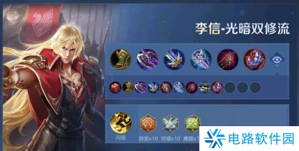 新版李信走双修流,出装上要有物理攻击和物理穿透保证光信的伤害,还要有攻速和坦度来保障暗信的强度。
