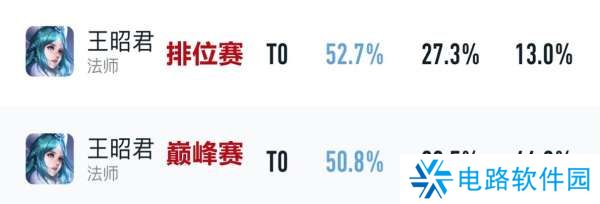 王昭君随着周年庆皮肤上线以及辅助玩法的开发,近期排位胜率52.7%、巅峰赛胜率50.8%,成为了新版本的上分黑马。