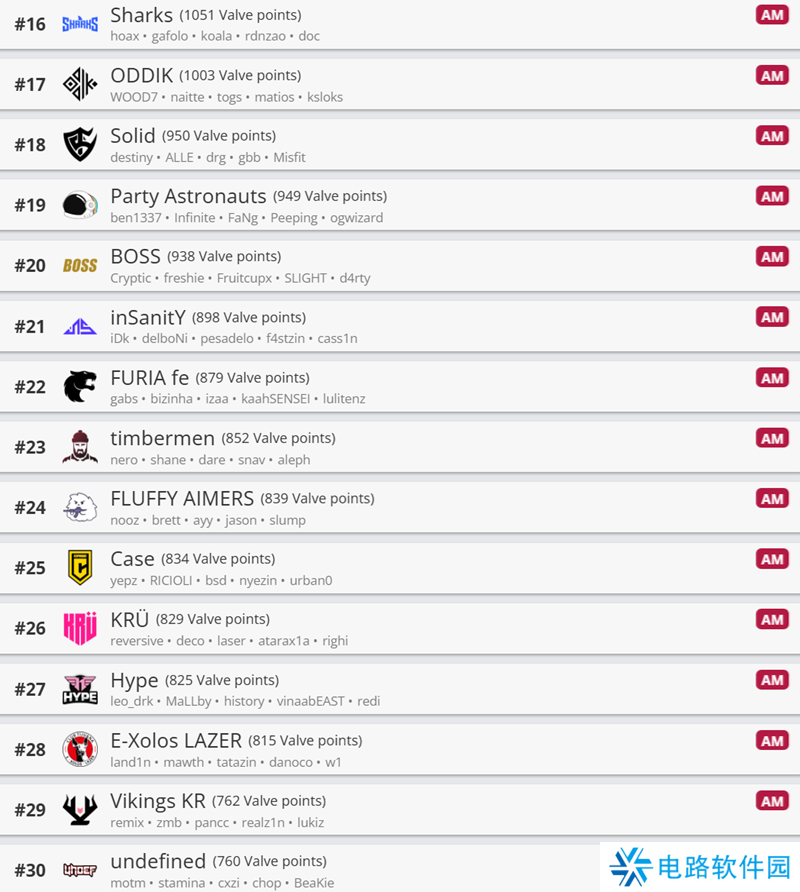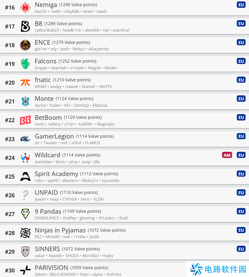 B8战队位列21名,他们在ECL 卡托维兹站中发挥出色。第30名战队是