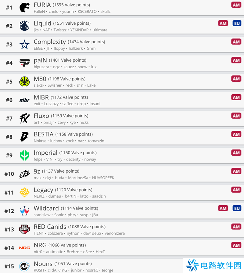 欧洲排名和世界排名基本一致。美洲排名中第一名是FURIA,第二是Liquid,第三则是