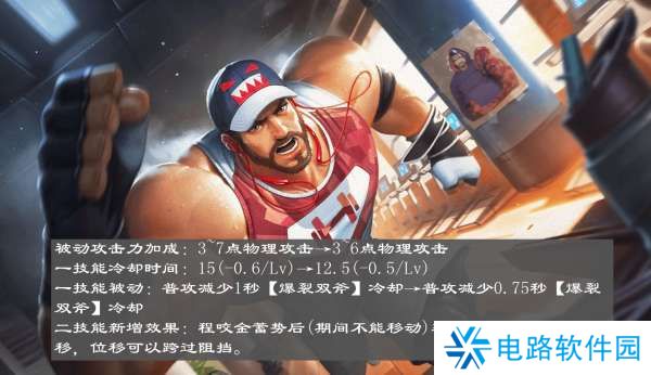 1技能减少2.5秒初始CD,后期减少2秒,作为限制普攻减少的1秒CD变成了0.75秒,也就是说程咬金可以少2下普攻,就能获得调整前的10秒CD。