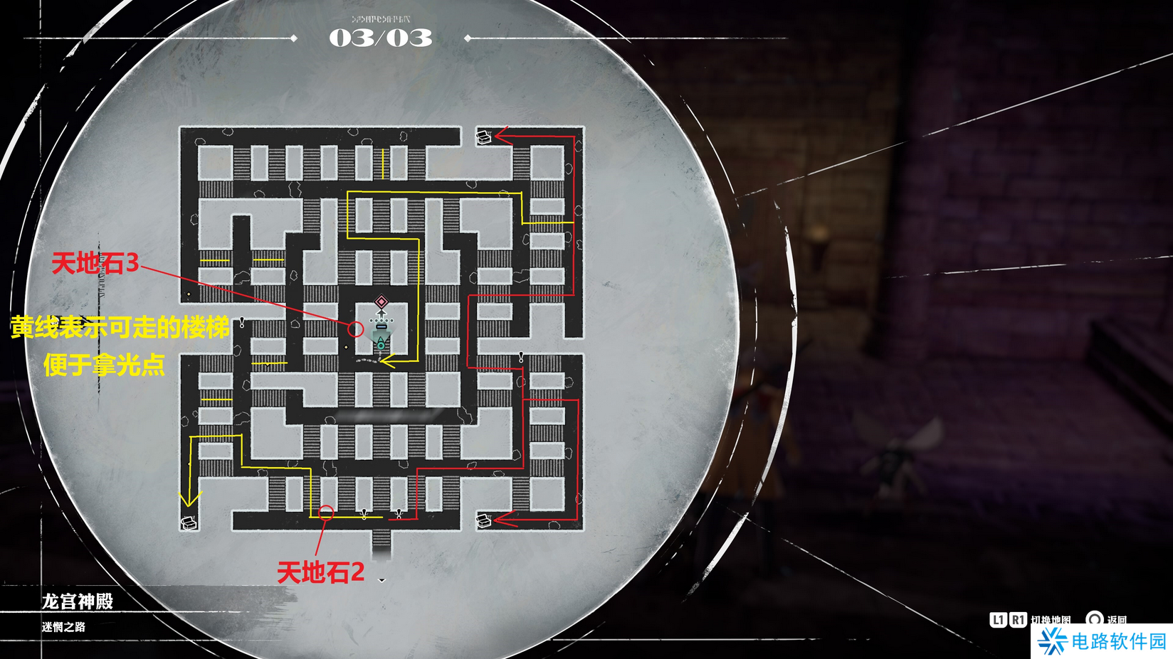 走右侧红线,按照红线向北走,最后再接着黄线走,到达最中间位置,别忘了左侧的天地石3要拿。