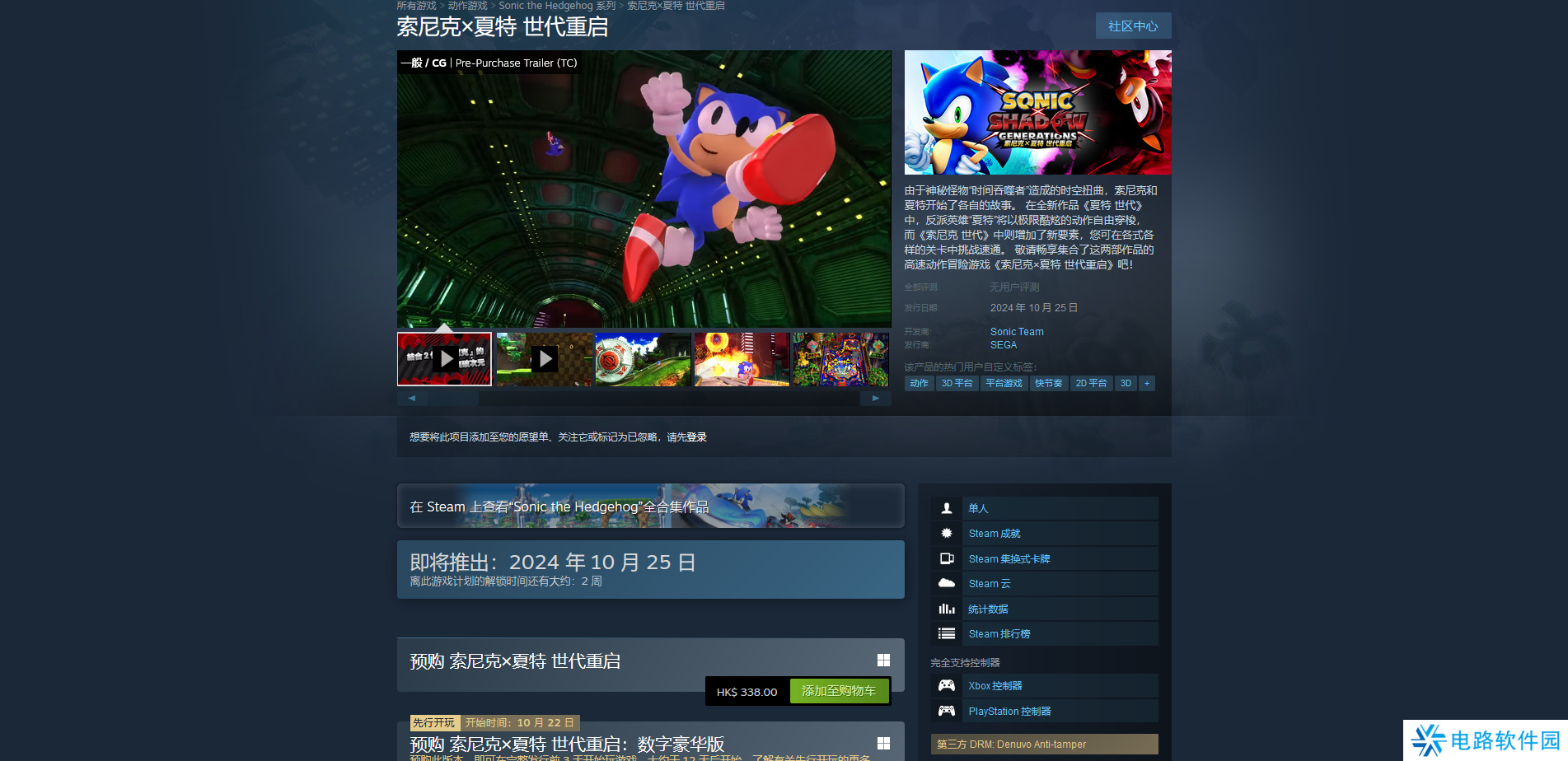 《索尼克×夏特 世代重启》Steam版的上线时间为2024 年 10 月 25 日上午10点左右,预载时间大概是前一天,也就是10月24日。