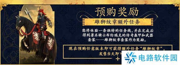 立即预购,获得雄狮纹章额外任务,您将体验一条独特的任务线,并在完成后得到著名骑士布伦瑞克的传奇盔甲和武器套装一一雄狮纹章套装作为奖励。