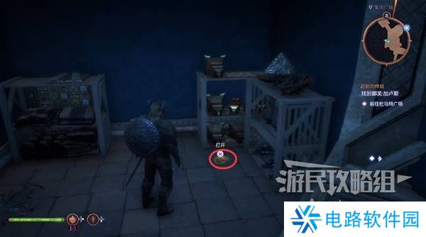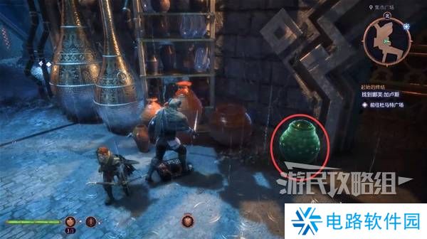 跟随瓦瑞克走过街道,遇到哈丁后注意探索地图,在每张地图的各种角落里都可以捡到黄金(货币)、材料、有价之物(用于卖钱)等。