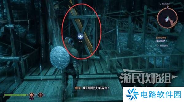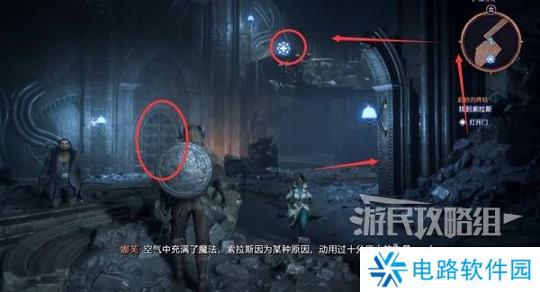 进洞后遇到关闭的大门,从右边走到高处,拉动机关开门。
