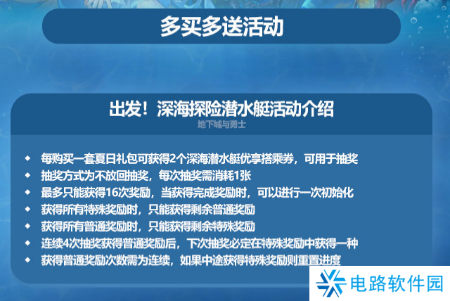 1、每购买一套夏日礼包,就可以获得2个深海潜水艇优享搭乘券,搭乘卷可用于抽奖