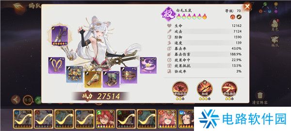 3、白毛玉鼠:单点爆发输出,用来过前排和打boss; 刚需三彩(五彩最佳),前期抽卡很容易抽出。天赋主点攻击,副点攻击爆伤,速度需调整至第三或第四出手。法宝:裁云。