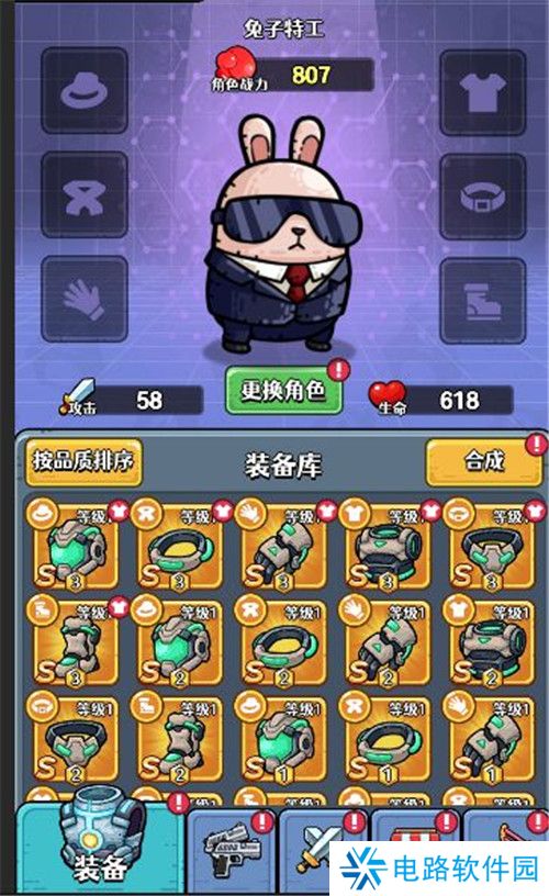 愤怒的兔子游戏的【装备系统】!装备系统包含了“装备穿戴”、“装备合成”、“装备强化”、功能,在这个页面中,特工们可以查看已获得装备、合成装备,强化装备进行战力提升。