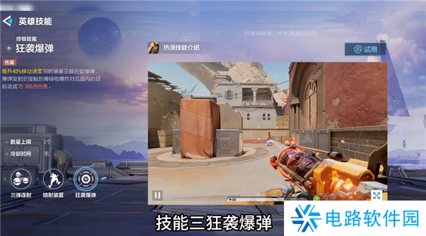 第三个技能狂袭爆弹,发射三枚巨型爆弹造成大范围伤害,基本擦到了就会阵亡,对于躲在障碍物后面的玩家非常有用。