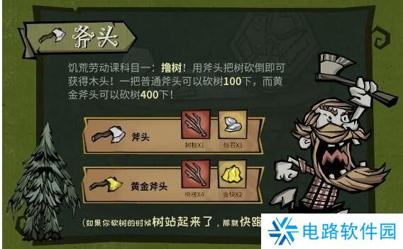 饥荒劳动课科目一:撸树!用斧头把树砍倒即可获得木头!一把普通斧头可以砍树100下,而黄金斧头可以砍树400下!