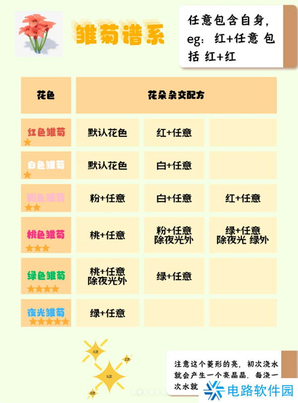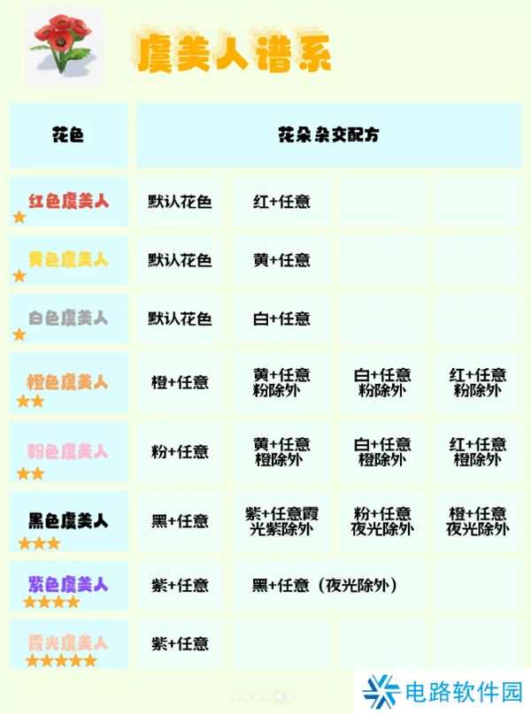 下面是各花卉谱系的杂交配方,直接参考即可。