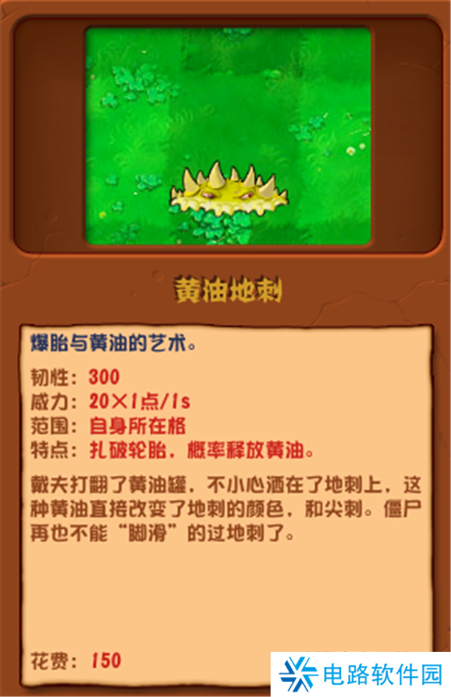 评价:草地上的尴尬存在,只能与轮胎一换一,效果甚至不如100阳光的大蒜花。面对巨人系列僵尸时,其效果更是微乎其微。