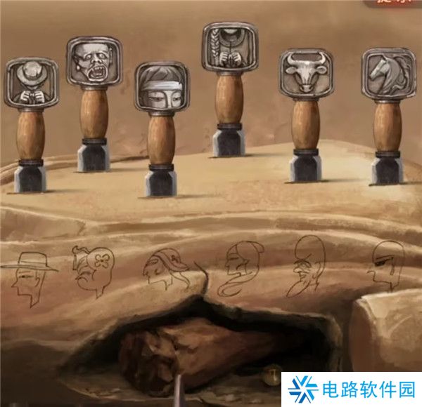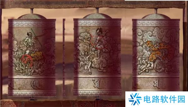 14、这个图案看起来也有些眼熟,后退一下来到沙漠,查看中间旋转圆筒,记下来车轮、弓箭、龙对应的符号,这里其实不确定那是龙还是蛇,好像是一条大蟒蛇,这不重要,如果难判断最后一个对应符号是这一个还是继续转的那一个,我们可以都记下来穷举一下就行了~遇到谜题有歧义最好的办法就是穷举法。