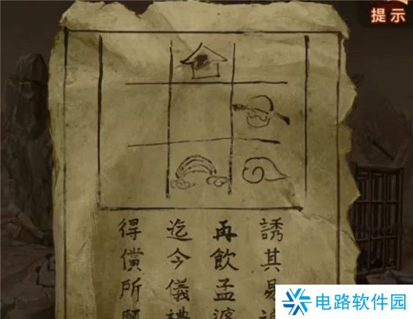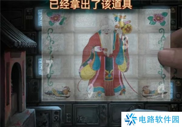 6、查看一下中间位置的无臂佛像,将两只手臂都给装上去后佛像双手合十起飞了,下面露出一个门,不过我们先不着急进门,在右边中间位置,彤彤晕倒的稍微往下一点的裂缝那里还有一张纸,查看一下有线索图,记下来上面中间房子,第二行右边戴帽子人,第三行中间彩虹右下角云彩。