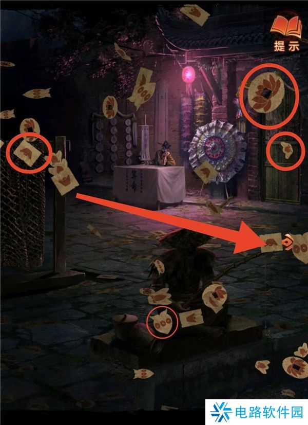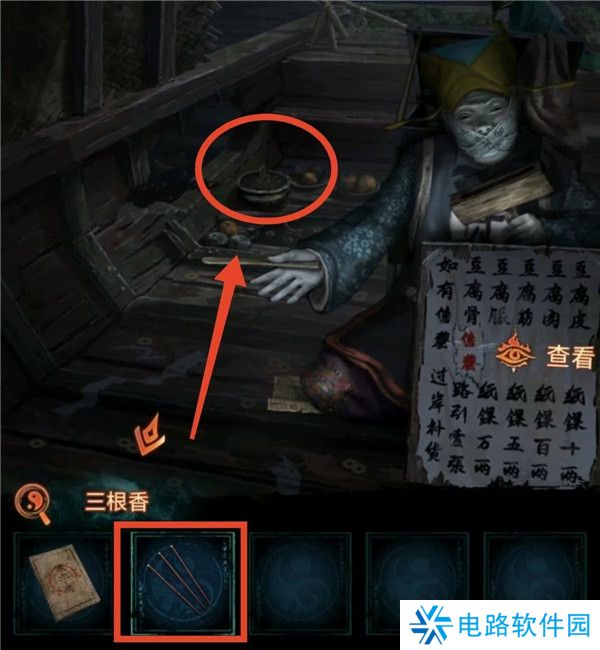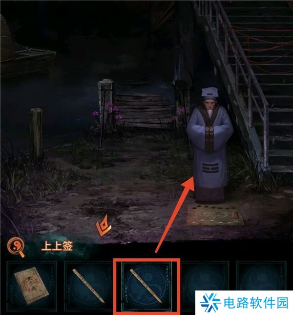 7、把遗照丢掉,看望远镜获得线索4,上桥按照线索4把人形孔明灯点亮成对应颜色,获得钩爪。去河边用钩爪把船勾过来上船,点柱香后获得纸鱼。