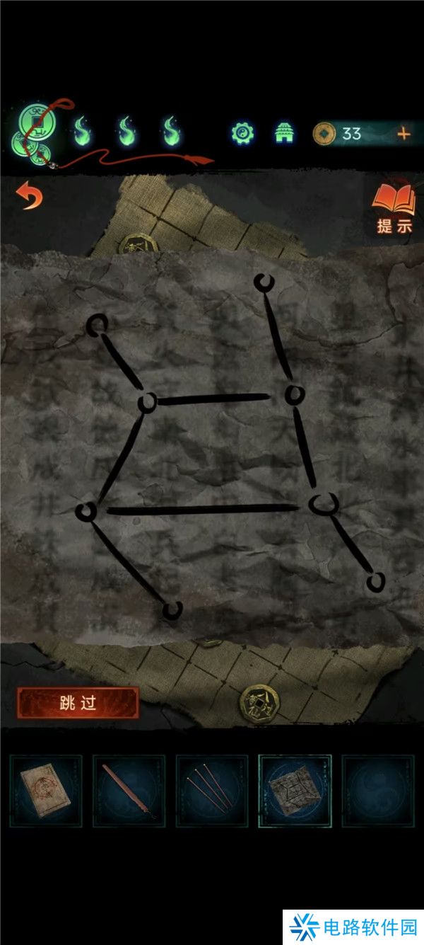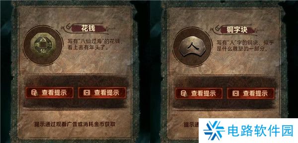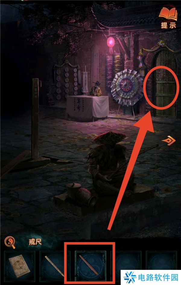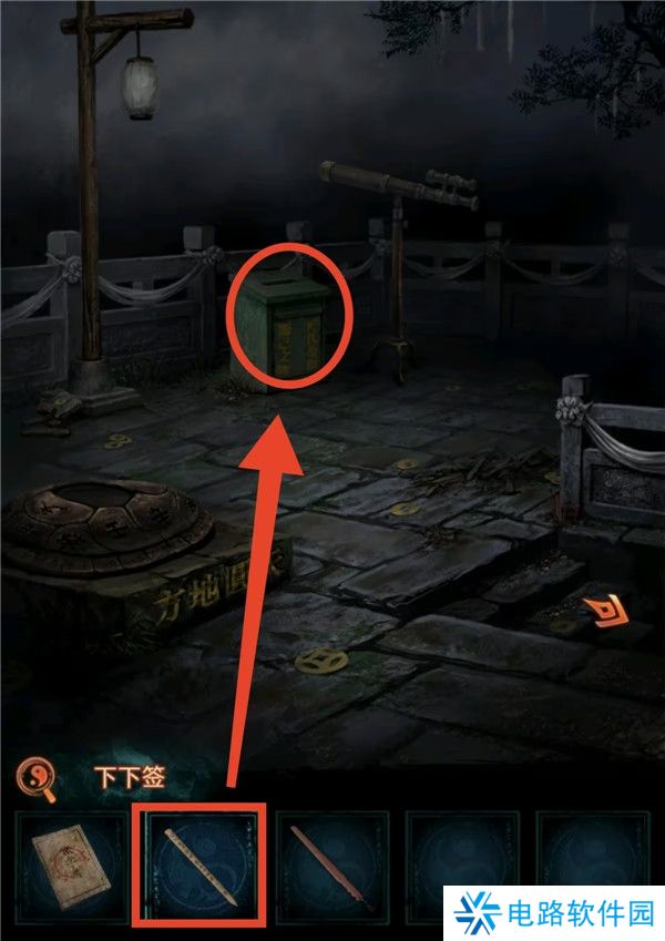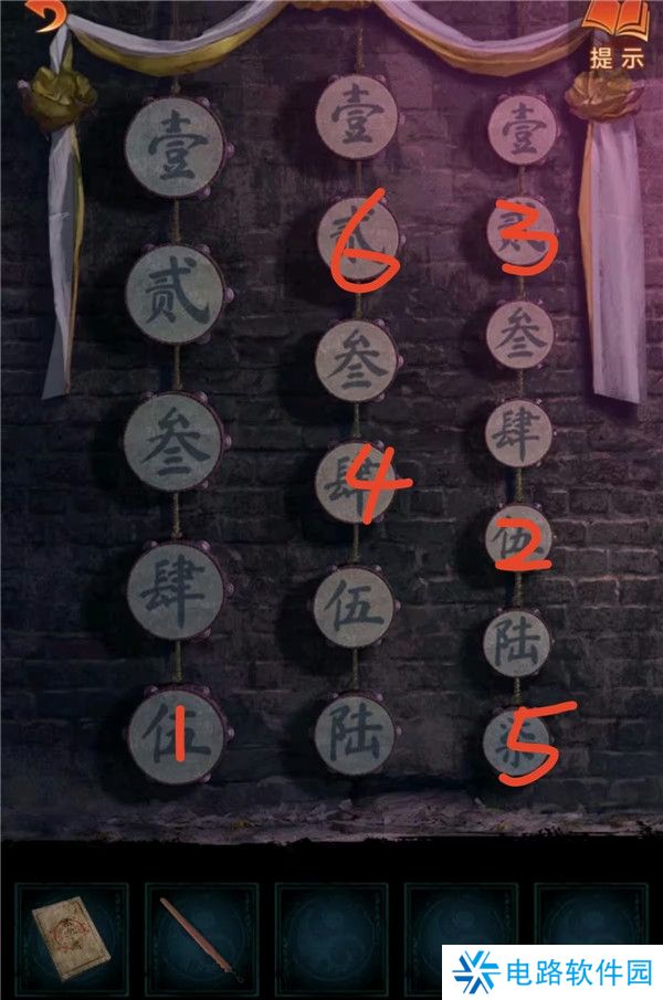4、用戒尺开门,把下下签丢了,灯笼亮红色去望远镜获得线索3,结合书上内容按顺序(如图所示)敲打老八旁边的鼓,获得花钱和龟壳。