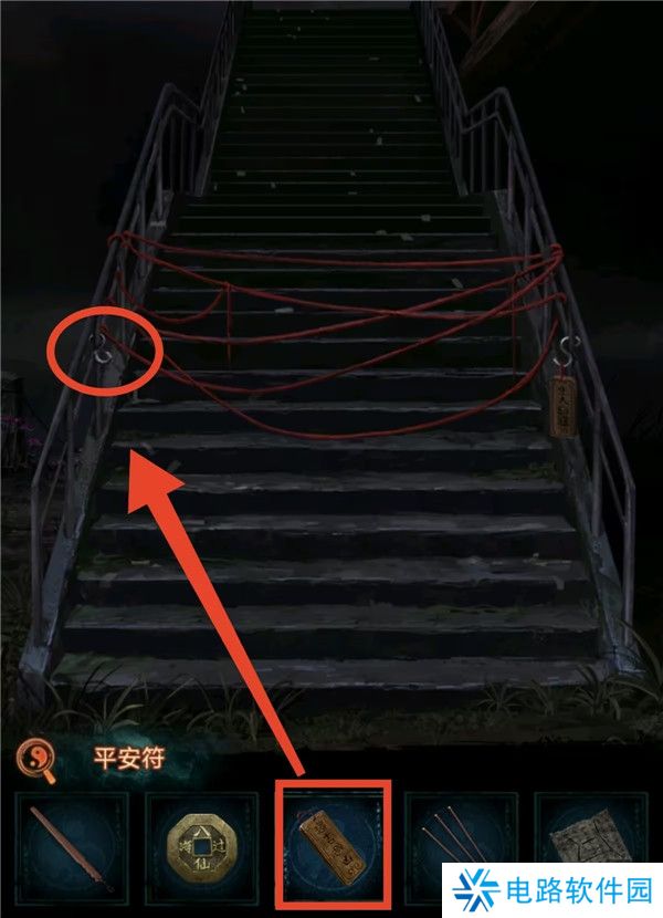 5、上楼,把龟甲补上,别忘记捡旁边的平安符。河边的楼梯,挂上平安符解除封印,上桥。